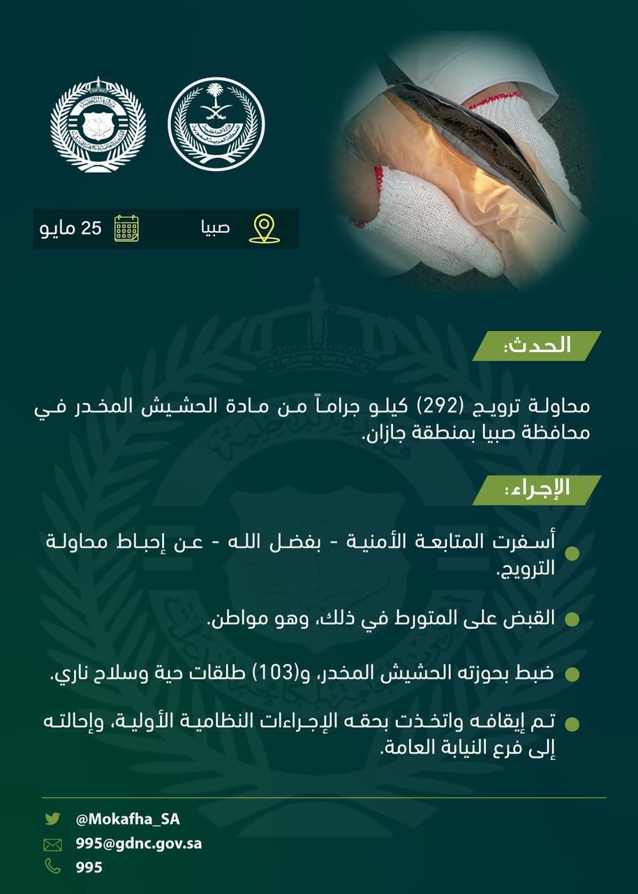 صرح المتحدث الرسمي للمديرية العامة لمكافحة المخدرات النقيب محمد النجيدي، بأن المتابعة الأمنية الاستباقية لنشاطات الشبكات الإجرامية التي تمتهن تهريب المواد المخدرة إلى المملكة، أسفرت - بتوفيق الله - عن القبض على مواطن استقبل كمية من المواد المخدرة بمحافظة صبيا بغرض ترويجها، والقبض عليه، وعثر بحوزته على (292) كيلو جرامًا من مادة الحشيش المخدر وسلاح ناري و(103) طلقات حية.