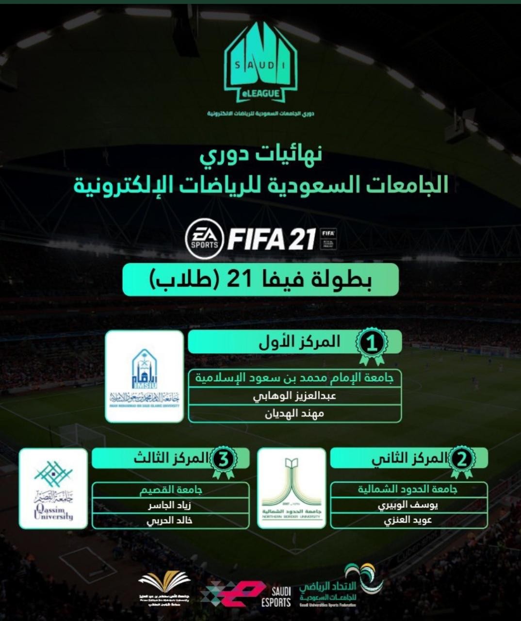 وفي مسابقة بطولة فيفا 21 طلاب حصلت المركز الأول جامعة الإمام محمد بس سعود و المركز الثاني جامعة الحدود الشمالية و المركز الثالث جامعة القصيم