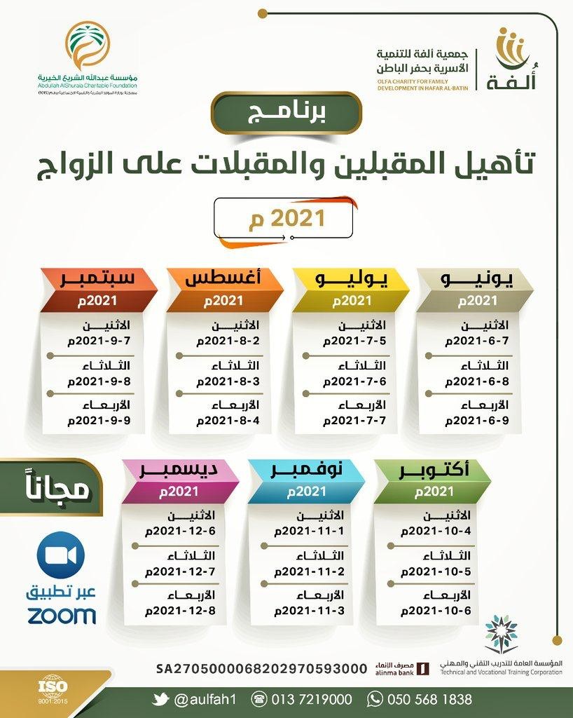أطلقت جمعية ألفة للتنمية الأسرية بمحافظة حفر الباطن بدعم من مؤسسة عبدالله الشريع الخيرية اليوم الاثنين، برنامج تأهيل المقبلين والمقبلات على الزواج للنصف الثاني لعام 2021 م، بواقع دورة في كل شهر بمعدل 15 ساعة تدريبية.