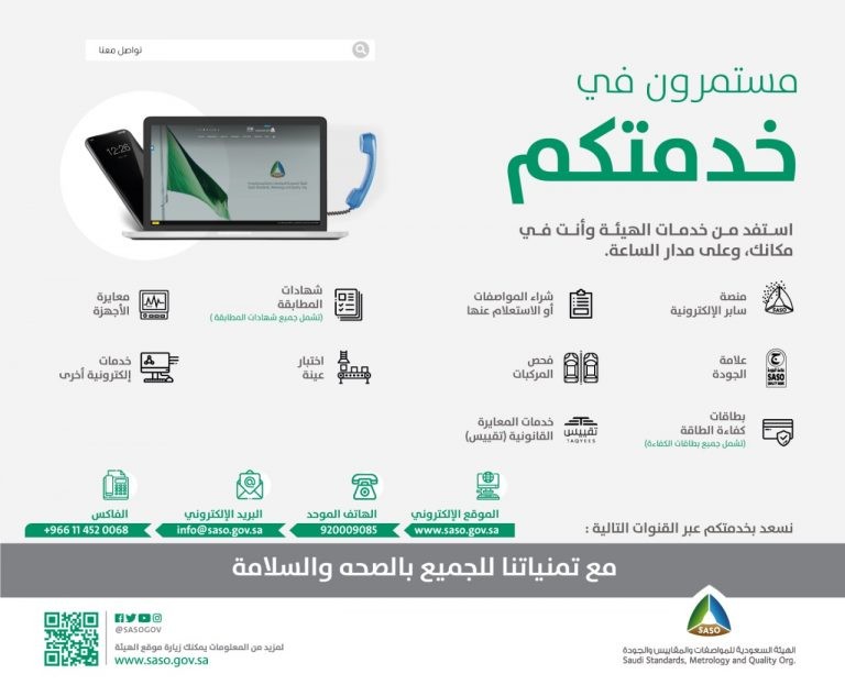 وأوضحت هيئة المواصفات أنه هذا التوجه يأتي ضمن جهودها لضمان استمرارية تقديم خدماتها المختلفة المخصصة للقطاع التجاري (التجار، مصنعين، موردين، جهات تقوم المطابقة) والمستهلك ، حيث يمكن للمستفيد الدخول للموقع الإلكتروني www.saso.gov.sa لإنهاء الإجراءات المتعلقة بمنصة سابر الإلكترونية، شراء المواصفات أو الاستعلام عنها، جميع شهادات المطابقة، معايرة الأجهزة، جميع الخدمات المتعلقة بعلامة الجودة السعودية، فحص المركبات، اختبار العينات، بطاقات كفاءة الطاقة، بطاقة ترشيد استهلاك المياه، خدمات المعايرة القانونية، وغيرها من الخدمات.