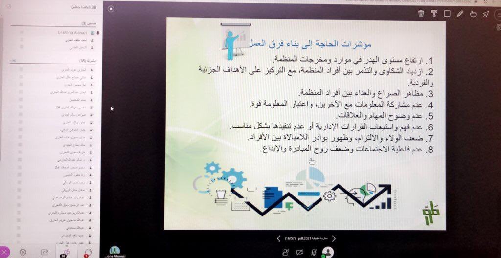 كما أتى من محاور الدورة في المستوى الأولى موشرات الحاجة إلى بناء فرق العمل و مهارات بناء وتحفيز فرق العمل وأداء فرق العمل وماهي مراحل تطويرها.