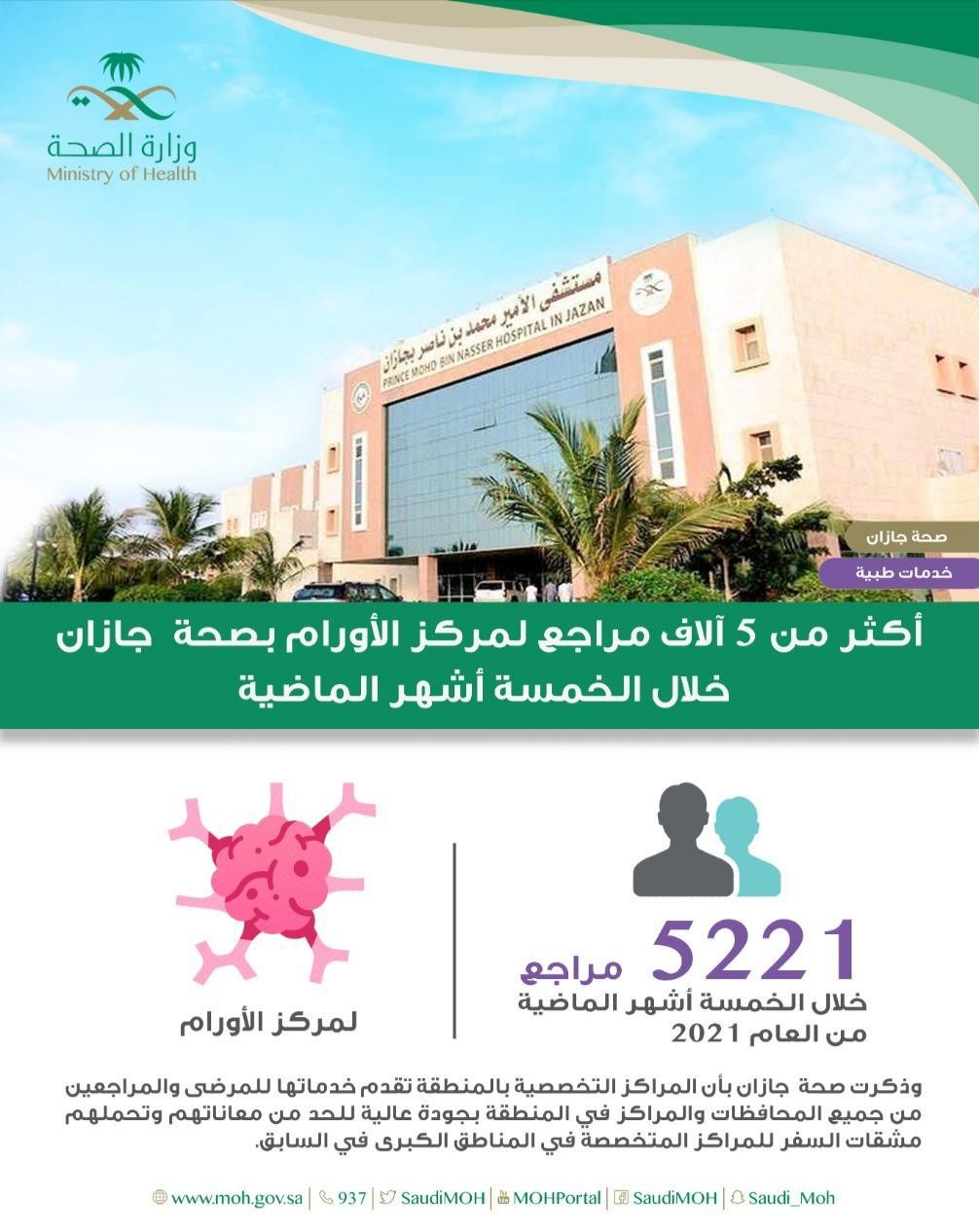 قدّم مركز الأورام بمستشفى الأمير محمد بن ناصر في جازان خدماته لـ 5221 مستفيداً، وذلك خلال الخمسة أشهر الماضية من العام 2021 م.