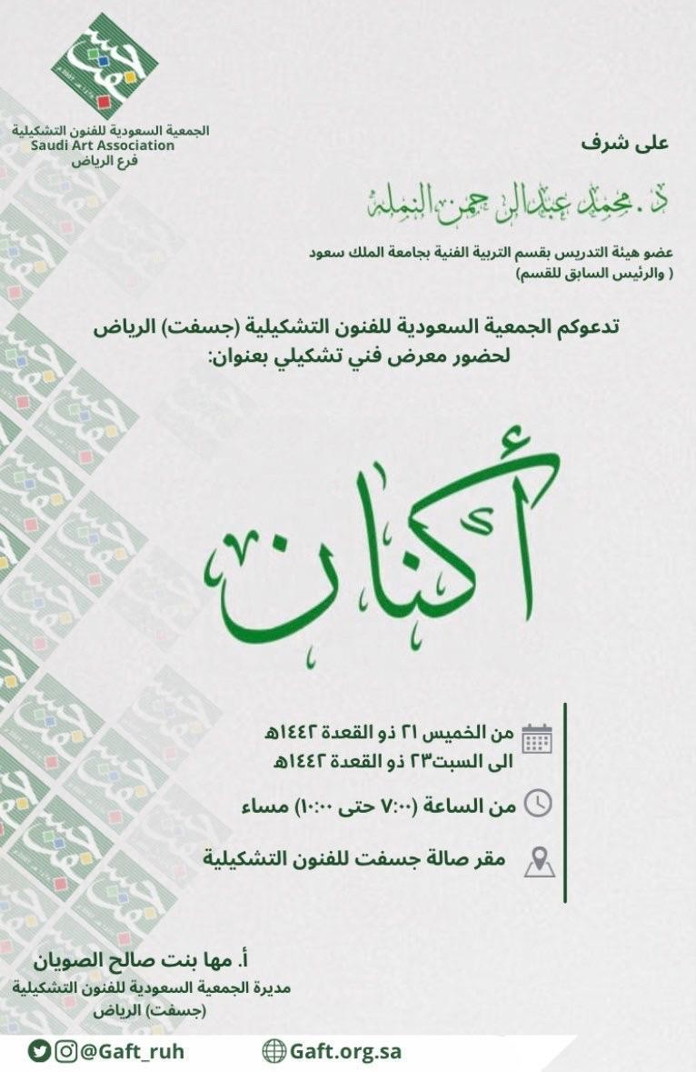 عضو هيئة التدريس بقسم التربية الفنية بجامعة الملك سعود (والرئيس السابق للقسم)  والذي يضم اعمال اكثر من 55 فنان تشكيلي وتحت اشراف الأستاذة مها بنت صالح الصويان مديرة الجمعية و أستاذ فهد العمار نائب المدير  الخميس القادم  21 إلي 23 ذي القعده ١٤٤٢ ه .