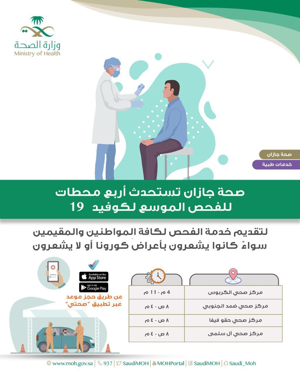 أعلنت صحة جازان عن بدء العمل في 4 محطات للفحص الموسع لفايروس كورونا "كوفيد 19 " وذلك لتقديم خدمة الفحص لكافة المواطنين والمقيمين.
