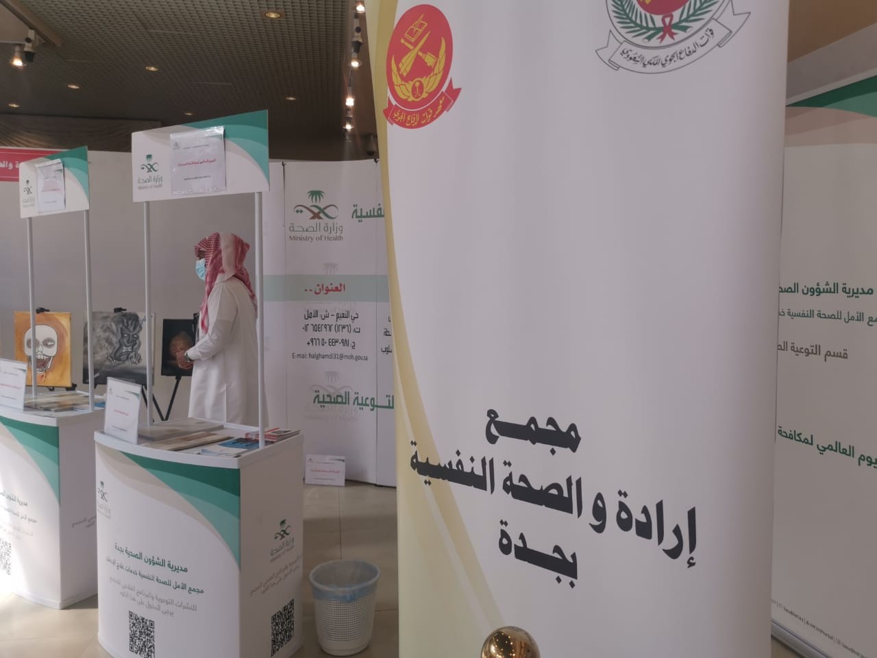 حيث دشن مجمع إرادة لخدمات إرادة بجدة المعرض التوعي الأول بعد التخفيف من إجراءات جائحة فايروس كورونا مع الإلتزام بكافة الإجراءات والإحترازات اللازمة والتباعد الإجتماعي ولبس الكمامة بشكل مستمر وعدم المصافحة في المديرية العامة لحرس الحدود ومعهد قوات الدفاع الجوي على مدار أسبوع كامل من ١٧ - ٢١ ذو القعدة ويقدم الإستشارات والإجابة على الأسئلة والإستفسارات وتوزيع المنشورات الورقية والرقمية عبر الباركود التي يحتاجها الزائرين لمقر المعرض ، وقد قدم المجمع خلال الأسابيع الماضية العديد من المحاضرات التوعوية بالتعاون مع قسم التوجيه المهني والعلاج بالعمل وقسم إرشاد التعافي إيماناً بدورهم التوعوي للتصدي لهذه الجائحة.