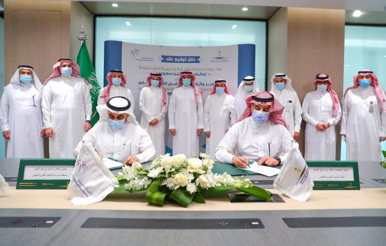 وكانت وزارة الصناعة والثروة المعدنية وكليات التميّز قد أبرمت أمس عقد المشروع في مقر الوزارة بالرياض وقعه نائب الوزير خالد بن محمد المديفر، فيما وقعه من جانب كليات التميّز رئيس مجلس الإدارة محافظ المؤسسة العامة للتعليم التقني والمهني الدكتور أحمد بن فهد الفهيد، وبحضور الرئيس التنفيذي لكليات التميّز المهندس أيمن بن مصطفى آل عبد الله، وعدد من مسؤولي الجانبين.