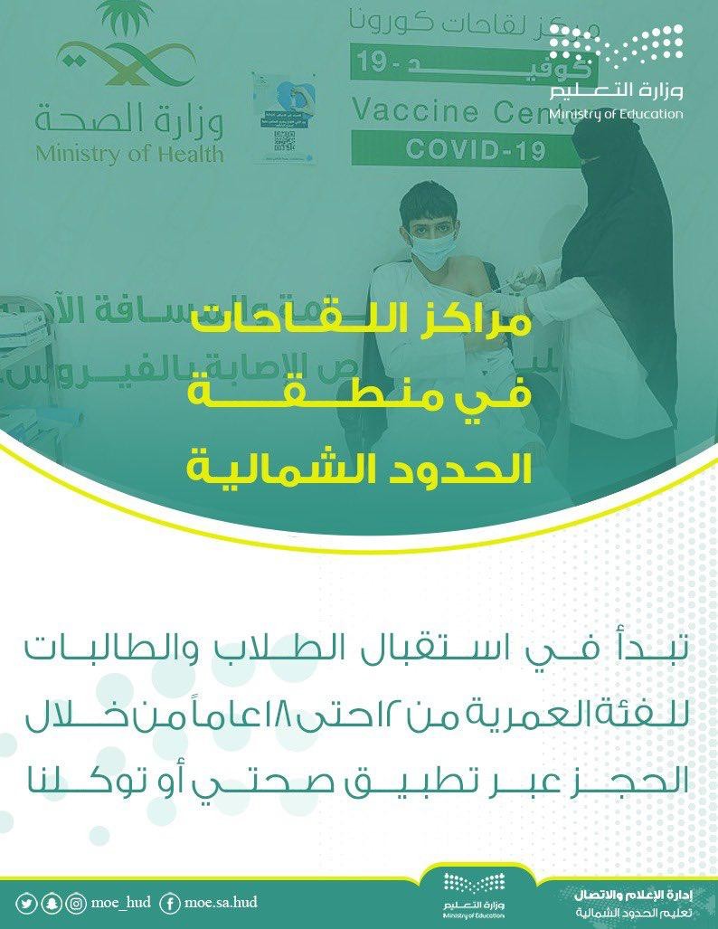 حيث وضحت مراكز اللقاحات في منطقة ⁧‫الحدود الشمالية‬⁩ بإن المراكز تبدأ في استقبال الطلاب والطالبات للفئة العمرية من ١٢ حتى ١٨ عاماً من خلال الحجز عبر تطبيق ⁧‫صحتي‬⁩ أو ⁧‫توكلنا‬⁩