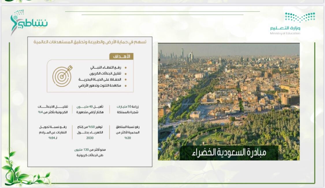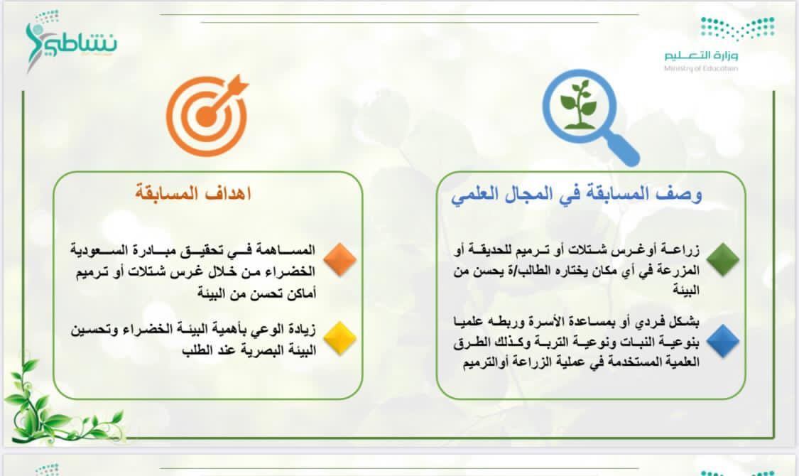 وأوضح مقدم البرنامج التدريبي ومنسق المسابقة بإدارة نشاط الطلاب المشرف التربوي سعيد مقليه ، أن المسابقة المقدمة ضمن فعاليات نشاطي صيف 1442هـ (حديقتي الخضراء) مسابقة طلابية علمية تساهم في تحقيق مبادرة السعودية الخضراء. كما تهدف إلى زيادة الوعي بأهمية البيئة الخضراء وتحسين البيئة، والعمل على تحقيق رؤية المملكة العربية السعودية ٢٠٣٠ في زيادة الرقعة النباتية وزراعة وتشجير ملياري شجرة خلال الفترة المقبلة.
