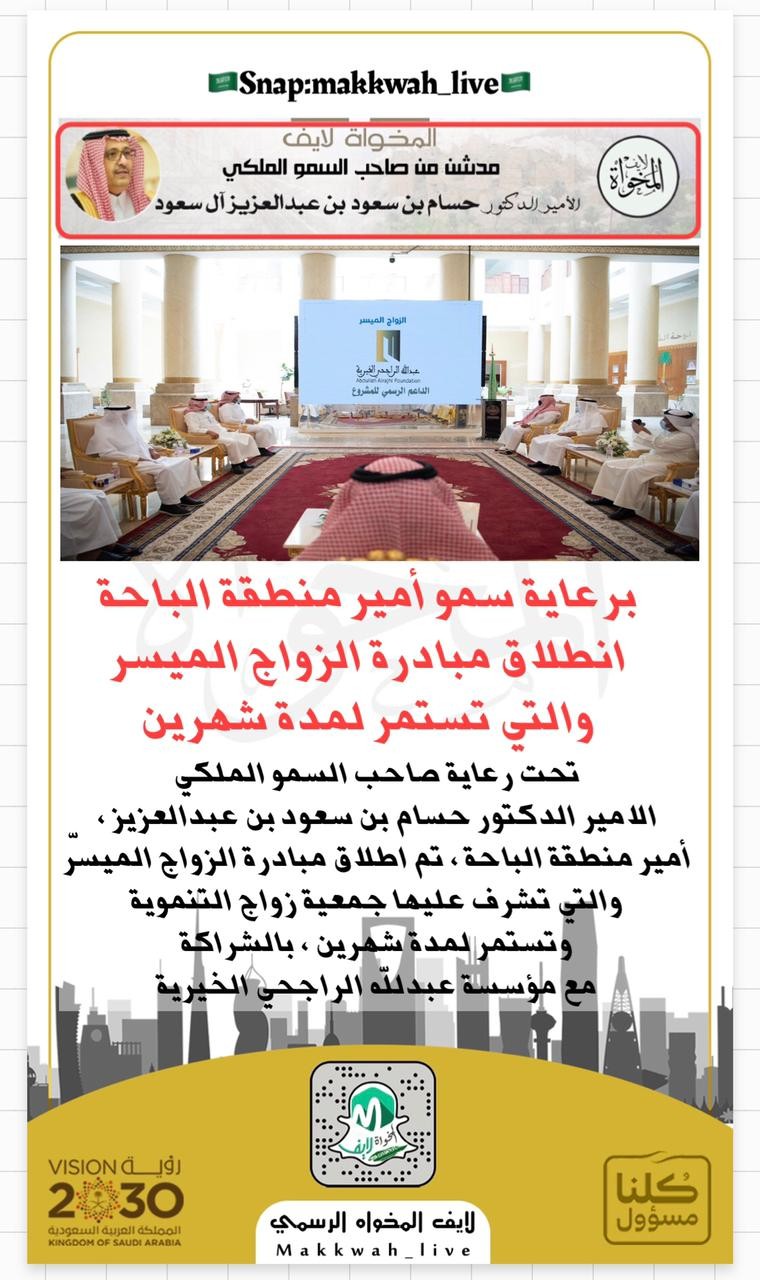 تحت رعاية صاحب السمو الملكي الامير الدكتور حسام بن سعود بن عبدالعزيز ، أمير منطقة الباحة ، تم اطلاق مبادرة الزواج الميسّر والتي تشرف عليها جمعية زواج التنموية وتستمر لمدة شهرين ، بالشراكة مع مؤسسة عبدالله الراجحي الخيرية ، وذلك بحضور سعادة وكيل امارة منطقة الباحة عبدالمنعم بن ياسين الشهري ورئيس مجلس ادارة جمعية زواج التنموية بمنطقة الباحة محمد بن غرم الله المبعوت وعدد من منسوبي الجمعية .