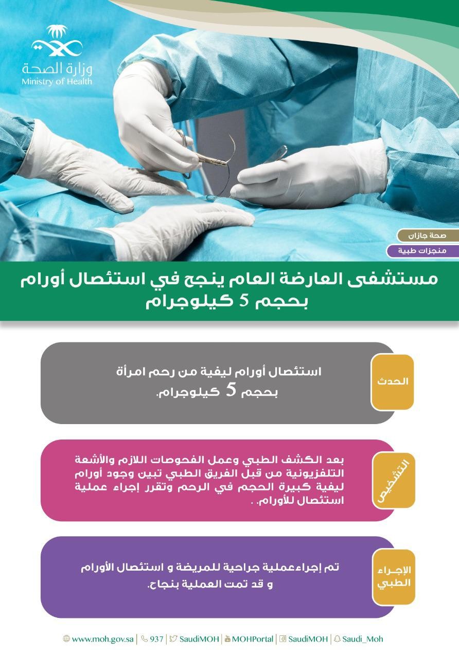 وفي التفاصيل ذكرت صحة جازان بأن المريضة حضرت لقسم الطوارئ بالمستشفى وبعد الكشف الطبي وعمل الفحوصات اللازمة والأشعة التلفزيونية تبين وجود أورام ليفية كبيرة الحجم في الرحم وتقرر إجراء عملية استئصال للأورام. .