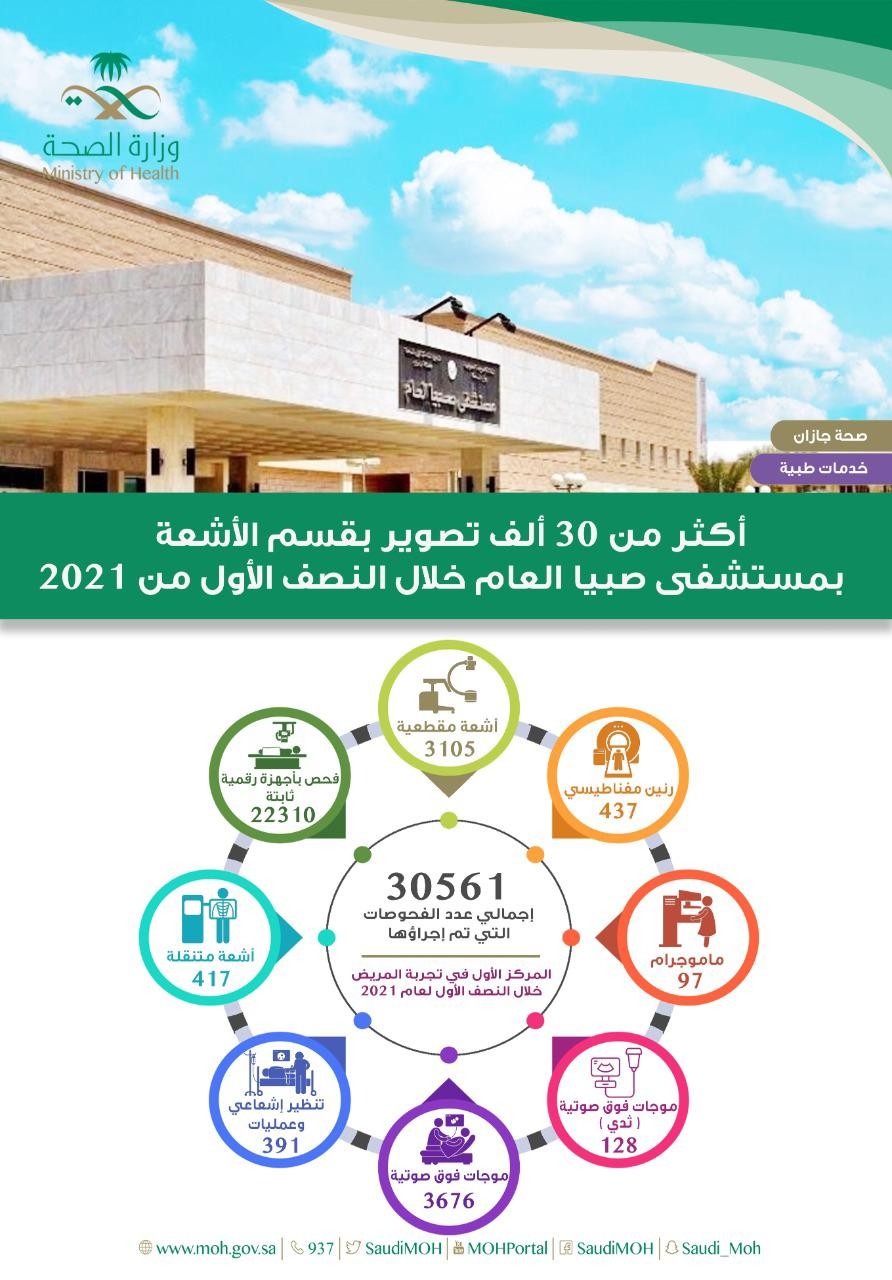 أجرى قسم الأشعة بمستشفى صبيا العام (30561) فحصًا إشعاعيًّا خلال النصف الأول من عام 2021م .