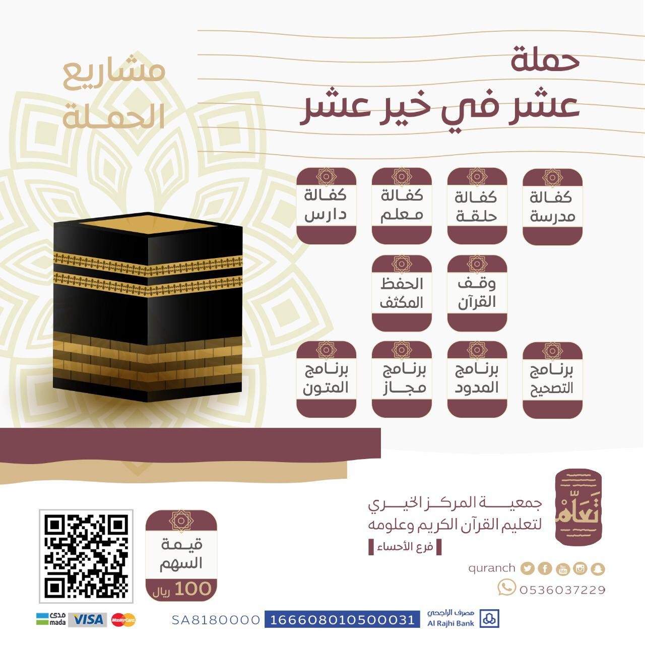 دشن رئيس الهيئة الإشرافية بجمعية المركز الخيري "تعلم" لتعليم القرآن الكريم وعلومه بالأحساء الدكتور خالد بن جاسم البريكان حملة عشر في خير عشر، وذلك في إطار دعم تعليم القرآن الكريم والعلوم الشرعية التي جعلتها الجمعية أحد أهدافها الإستراتيجية.