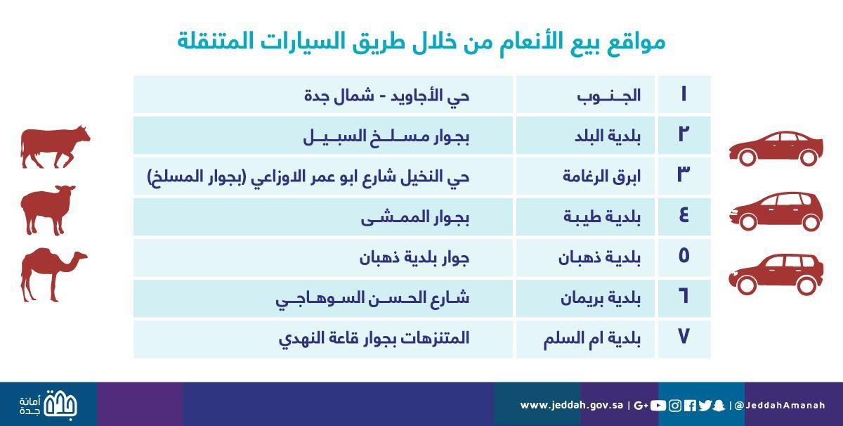 وأكدت أمانة جدة أن نقاط بيع الأنعام ستكون موزعة في أنحاء المحافظة ويسمح من خلالها البيع من السيارات المتنقلة، كما روعي في تلك المواقع عدم إعاقة الحركة المرورية وخدمة أكبر شريحة من سكان المدينة، وكذلك تنظيم عمليات البيع وعدم السماح بالبيع العشوائي.