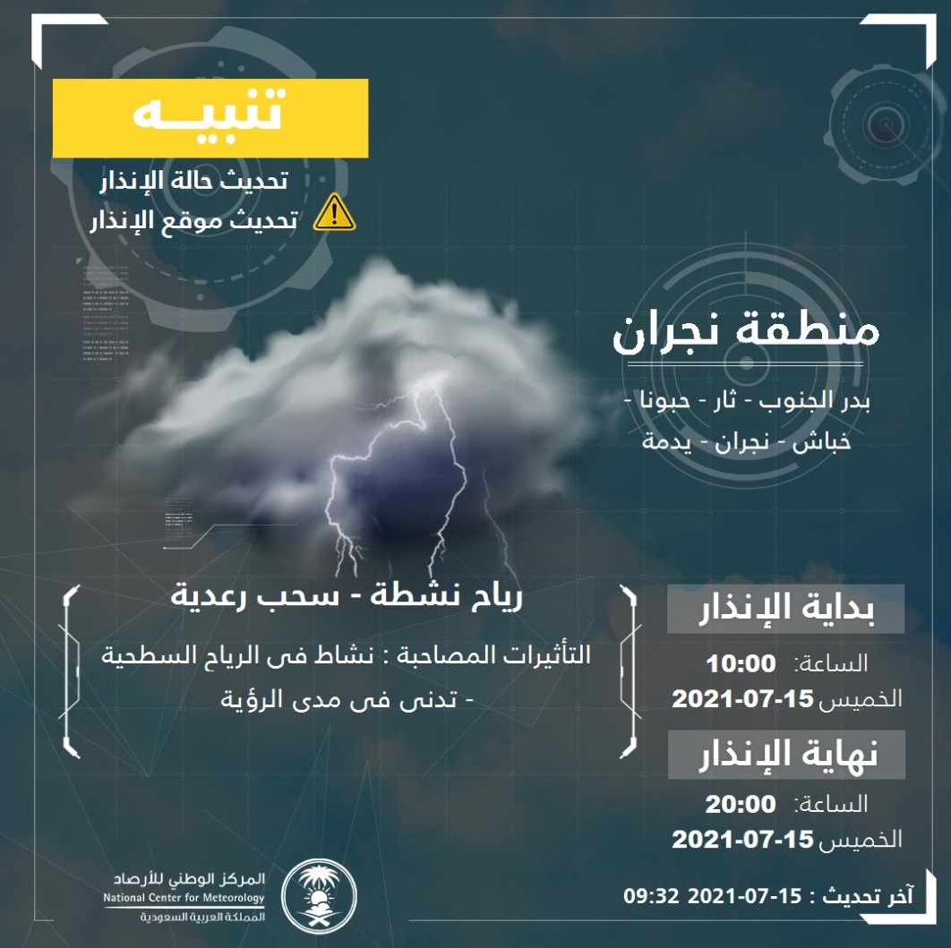 المركز الوطني للأرصاد: رياح نشطة وسحب رعدية على منطقة نجران