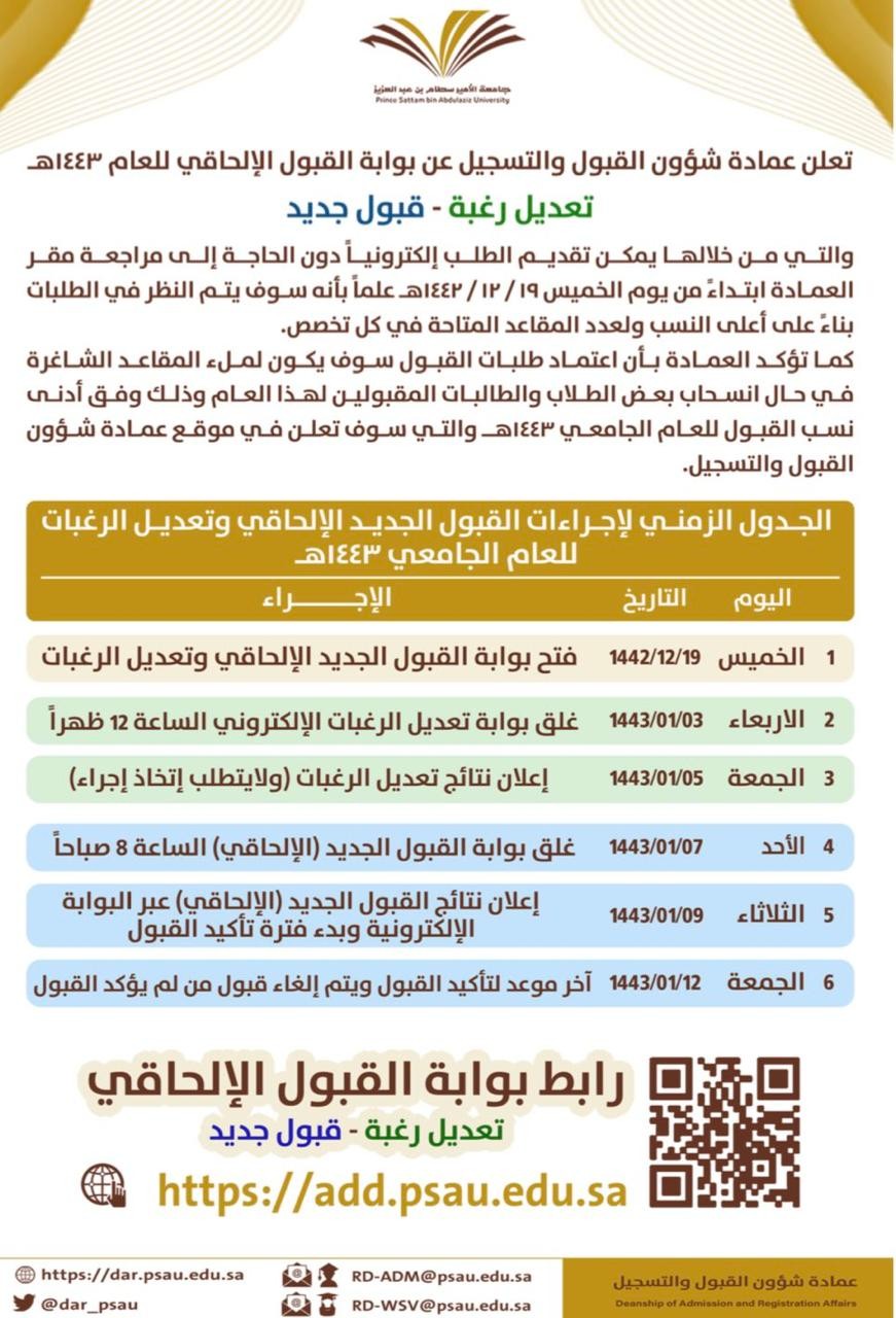 ويستمر القبول حتى يوم الأحد 7 - 1 - 1443هـ .