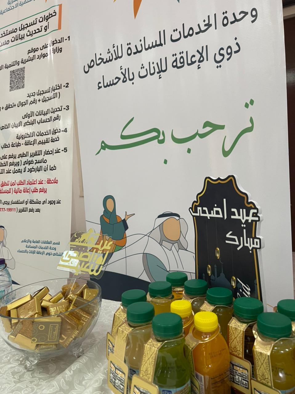 نظمت وحدة الخدمات المساندة للأشخاص ذوي الإعاقة للإناث بالأحساء صباح اليوم الاثنين حفل المعايدة السنوي لعيد الأضحى المبارك لمنسوباتها ومستفيداتها المراجعات من ذوي الإعاقة وأولياء امورهن، تحت شعار (العيد فرحة).
