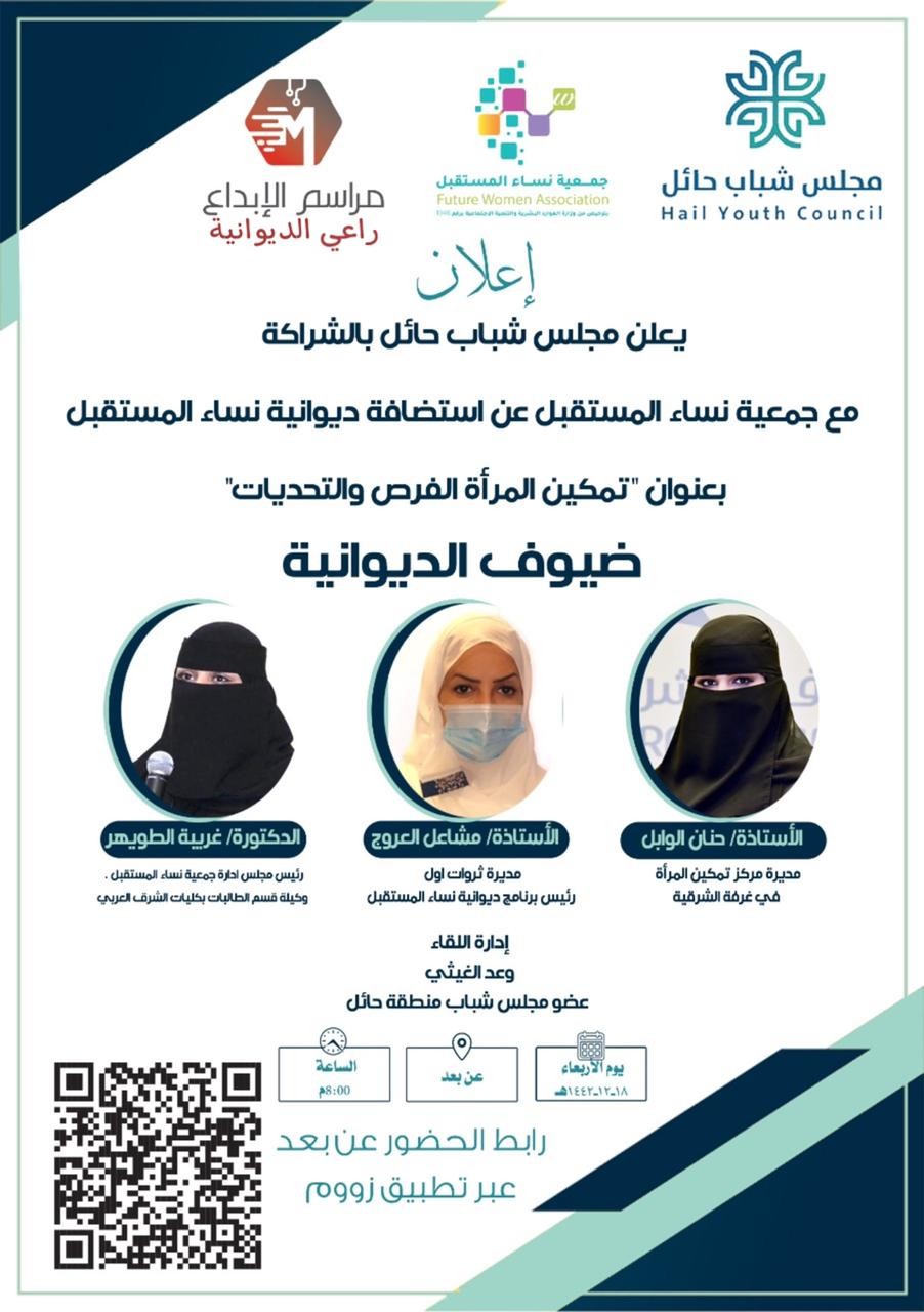 يستضيف مجلس شباب منطقة حائل بالشراكة مع جمعية نساء المستقبل يوم الأربعاء الموافق ١٨-١٢-١٤٤٢هـ برنامج ديوانية نساء المستقبل بلقاء حواري بعنوان تمكين المرأة الفرص والتحديات.