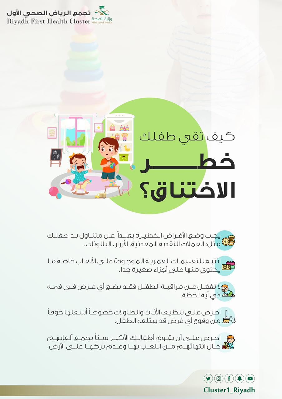 حذر تجمع الرياض الصحي الأول من إبتلاع الطفل للأجسام الغريبة؛ مما قد يؤدي إلى اختناقه وإغلاق المجرى التنفسي بالكامل ويتسبب في حدوث مضاعفات له -لا سمح الله-.
