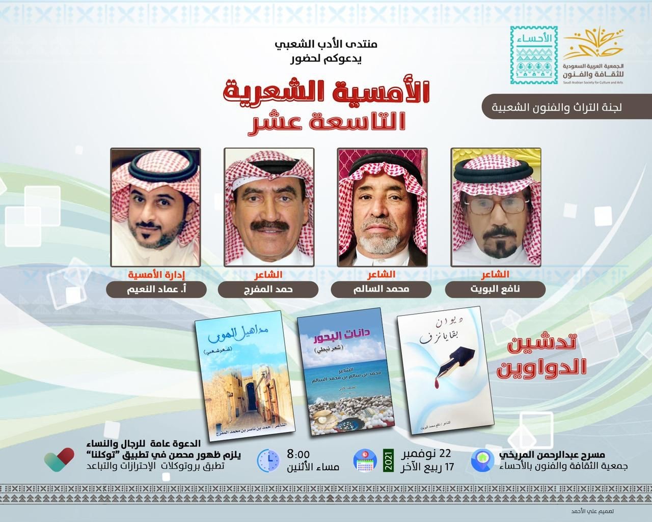 يستعد منتدى الأدب الشعبي التابع للجنة التراث والفنون الشعبية بجمعية الثقافة والفنون بالأحساء لتنظيم الأمسية الشعرية التاسعة عشر و تدشين مجموعة من الدواوين الشعرية وذلك مساء يوم الاثنين المقبل ١٧ ربيع ثاني ١٤٤٣ ، وقد بين رئيس المنتدى الشاعر الأستاذ راشد القناص بأن الشعراء المشاركين بالأمسية هم كل من الشاعر نافع البويت وتدشين ديوانه بقايا نزف ، والشاعر محمد السالم و تدشين ديوانه دانات البحور ، والشاعر حمد المفرج وتدشين ديوانه مداهيل الهوى ، فيما يقدم الأمسية الشاعر عماد النعيم .