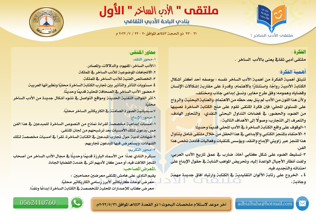 ينظم النادي الأدبي الثقافي بمنطقة الباحة ملتقى "الأدب الساخر" الأول وذلك في 21- 23 من شهر ذي الحجة الموافق ٢١ - ٢٣/ ٧ / ٢٠٢٢م محددًا آخر موعد لاستلام ملخصات البحوث في غرة شهر ذي القعدة من عام 1443 هجري، ٣١ / ٥ / ٢٠٢٢ م ويأتي هذا الملتقى بعد النجاحات التي حققها النادي في مهرجانات الشعر وملتقيات الرواية والقصة والمسرح، وأشار رئيس النادي الأدبي الأستاذ حسن بن محمد الزهراني بأن فكرة الملتقى انبثقت من أهمية الأدب الساخر نفسه ؛ بوصفه أحد أكثر أشكال الكتابة الأدبية رواجا، واستئثارا بالاهتمام، وقدرة على مقاربة إشكالات الإنسان وقضاياه وهمومه، وفق طرح مغاير، ونسق إبداعي جاذب ومختلف مضيفًا بأن هذا اللون من الأدب لم ينل بعد حظه من الاهتمام، والعناية البحثية، والرواج على المستوى المحلي، مبينًا إن فكرة الملتقى تقوم على منح الكتابة الساخرة نصيبها من الضوء، والحضور، في فضاءات التداول البحثي النقدي، والتحاور الهادف، والتعرف إلى التجارب، وعن أهداف الملتقى أوضح الزهراني بأن هناك عدة أهداف :