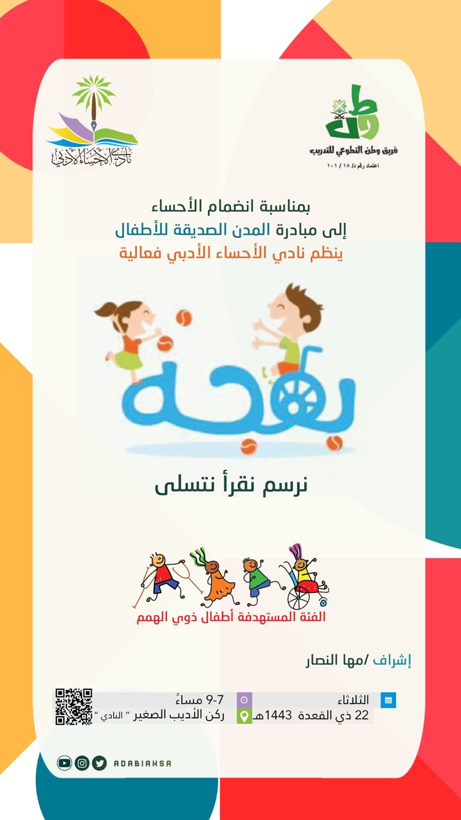 ينظم نادي الأحساء الأدبي الثقافي من خلال ركن الأديب الصغير في النادي فعالية " بهجة " للأطفال من الساعة السابعة حتى التاسعة من مساء الثلاثاء ٢٢ من ذي القعدة ١٤٤٣هـ الموافق ٢١ من يونيو ٢٠٢٢م في مقر النادي .
