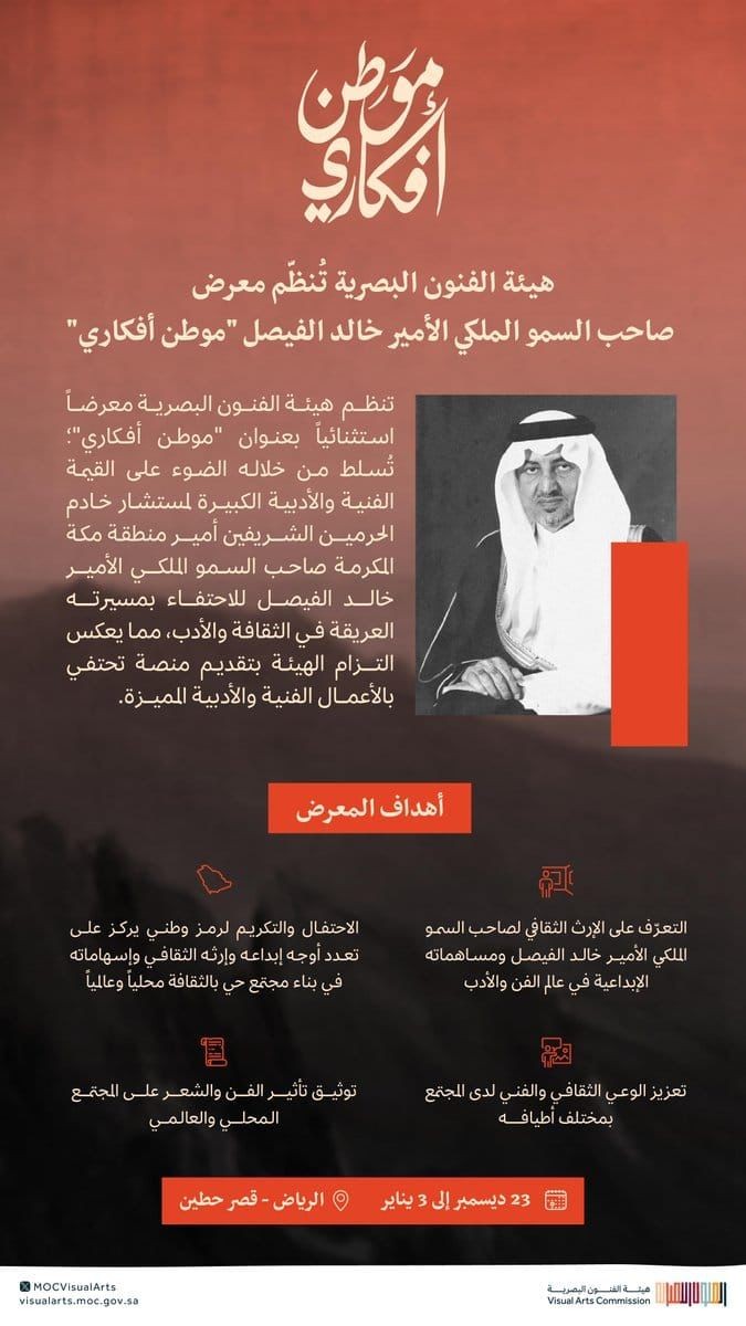 ويعكس معرض "موطن أفكاري" التزام الهيئة بتقديم منصةٍ تحتفي بالأعمال الفنية والأدبية للأمير خالد الفيصل.