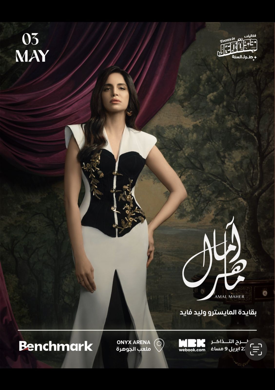 بعد النجاح الباهر لحفل الفنانة آمال ماهر في مصر، تستعد جدة لإقامة أولى الحفلات الغنائية والتي ستبدأ بالفنانة المتألقة آمال ماهر وذلك يوم الثالث من مايو، حيث يقام الحفل برعاية بنش مارك في ملعب الجوهرة ، وسوف تطرح التذاكر عبر تطبيق Webook الساعة التاسعة من مساء يوم الثاني والعشرون من أبريل .