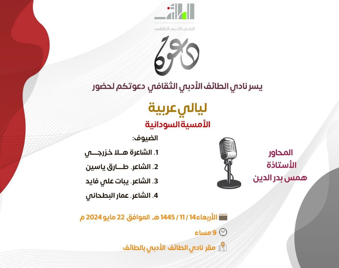 الأربعاء المقبل : أدبي الطائف يعلن انطلاق برنامج "ليالي عربية"بالأمسية السودانية