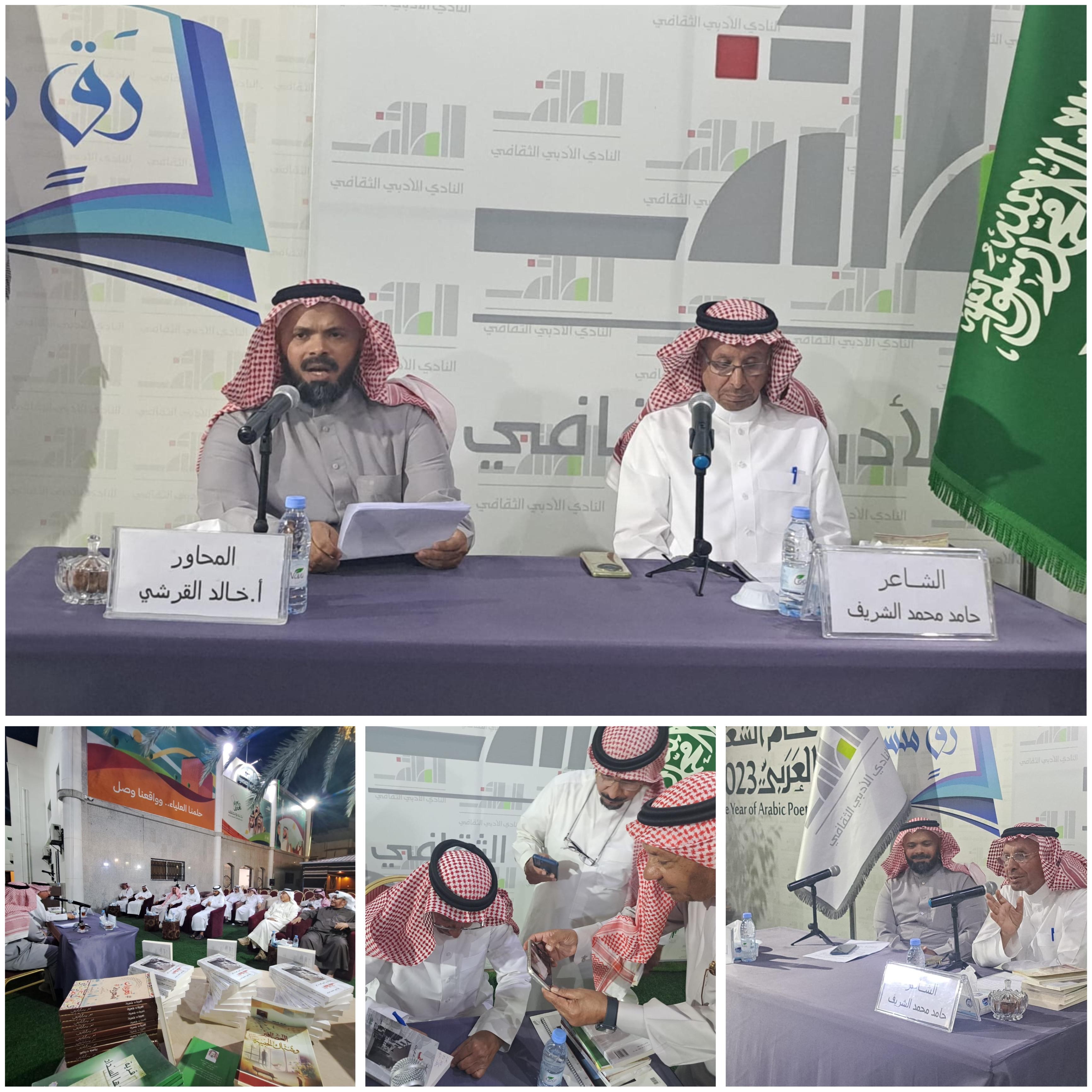 وقد أدار الأستاذ خالد القرشي اللقاء عبر محاور عديدة تنقل فيها بين نشأة الشريف  بالطائف وتجربته الشعرية وانتقاله إلى الرياض ، مستعرضا عددا من القصائد الشعرية  في الديوان .