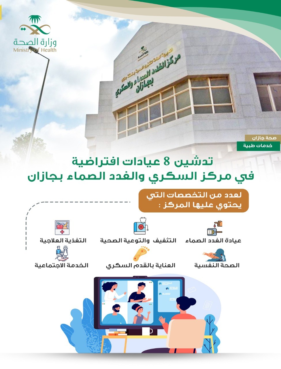 فعلت صحة جازان عدد " 8 " عيادات افتراضية بمركز السكري والغدد الصماء وذلك تماشياً مع خطة التحول الصحي التي تهدف الى تمكين المستفيدين من الحصول على الخدمة الصحية بكل يسر وسهولة ومن دون تكبد عناء ومشقة الحضور الى مقر العيادة