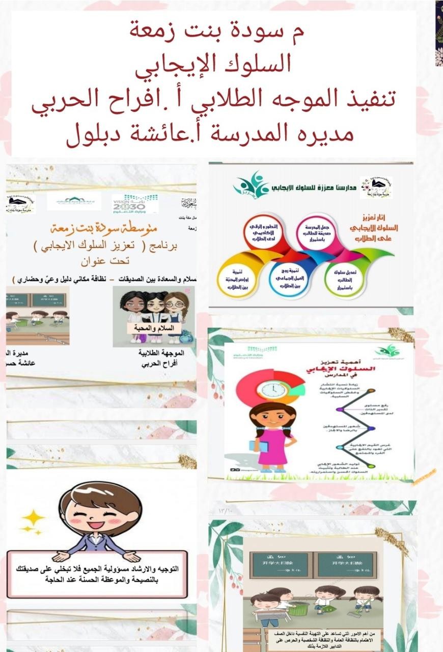 نفذت متوسطة سودة بنت زمعة التابعة لمكتب تعليم شمال مكة بالإدارة العامة للتعليم بمنطقة مكة المكرمة يوم الإثنين الموافق ٥ / ٣ / ١٤٤٣ه، برنامجاً تعريفياً لتعزيز السلوك الايجابي بعنوان (نجتمع معاً نحو همم عالية للوصول للقمة)، نفذه الموجهة الطلابية أفراح الحربي بمساندة مديرة المدرسة عائشة دبلول مُستهدفاً الطالبات وذلك بهدف