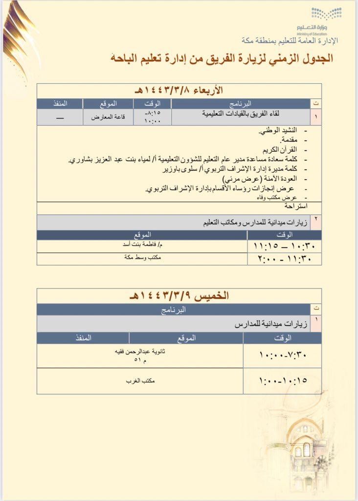 هذا وشمل برنامج الوفد التعليمي على زيارة  كل من متوسطة فاطمة بنت أسد ، ومكتب تعليم وسط مكة ، وثانوية عبدالرحمن بن فقيه ، والمتوسطة الواحدة والخمسون ، ومكتب تعليم الغرب للاطلاع على أبرز وأهم الممارسات النوعية التي شهدها الميدان التعليمي  .