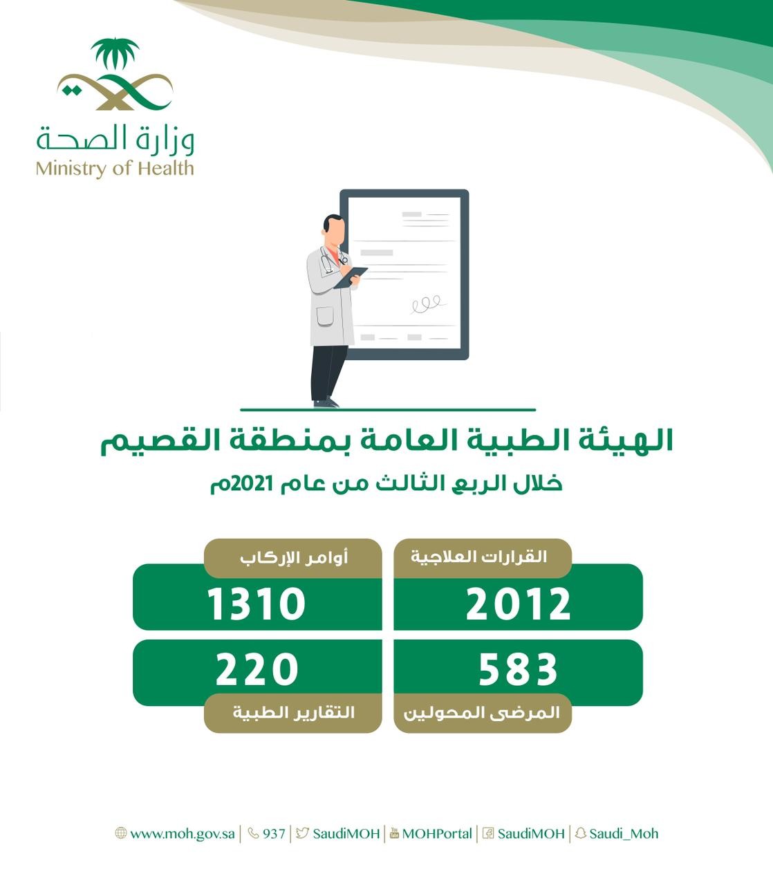 أوضحت صحة القصيم أن عدد المستفيدين من خدمات الهيئة الطبية العامة بلغ 583 مستفيداً خلال الربع الثالث من عام 2021م وذلك من خلال إصدار عدة قرارات علاجية اشتملت على أوامر الاركاب والطالبات الحكومية وكذلك المرضى المحولين خارج المنطقة والتي بلغت للمستفيدين 583 قراراً فيما بلغت القرارات العلاجية 2012 وبلغت عدد أوامر الإركاب للمستفيدين من الهيئة الطبية 1310 فيما بلغ عدد التقارير الطبية الصادرة 220 تقريراً.