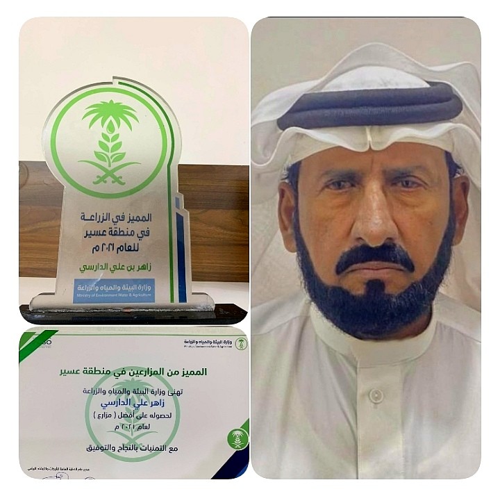 كرم فرع وزارة البيئة والمياه والزراعة بعسير المزارع زاهر بن علي الدارسي لحصوله على "أفضل مزارع" بمنطقة عسير لعام 2021.