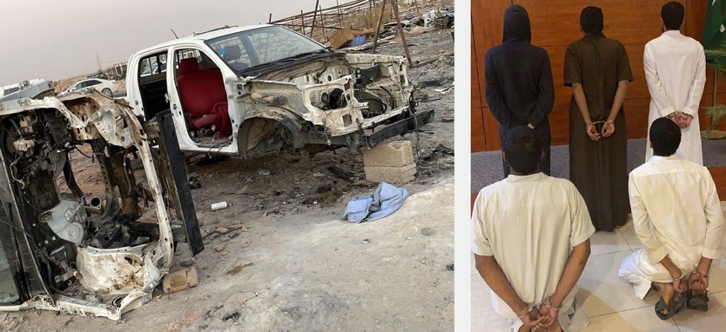 صرّح المتحدث الإعلامي لشرطة منطقة الرياض الرائد خالد الكريديس، بأن المتابعة الأمنية لجرائم الاعتداء على الأموال وتعقب مرتكبيها، أسفرت عن القبض على (5) أشخاص، (3) مواطنين ومخالفين لنظام أمن الحدود من الجنسية اليمنية، ارتكبوا سرقة (6) مركبات وتفكيكها وبيع أجزائها، والقيام بإتلاف الهياكل المتبقية لإخفاء جرائمهم عن طريق إحراقها، كما استُردت مركبتان قبل تفكيكها، وجرى إيقافهم واتخذت بحقهم الإجراءات النظامية الأولية وإحالتهم للنيابة العامة.