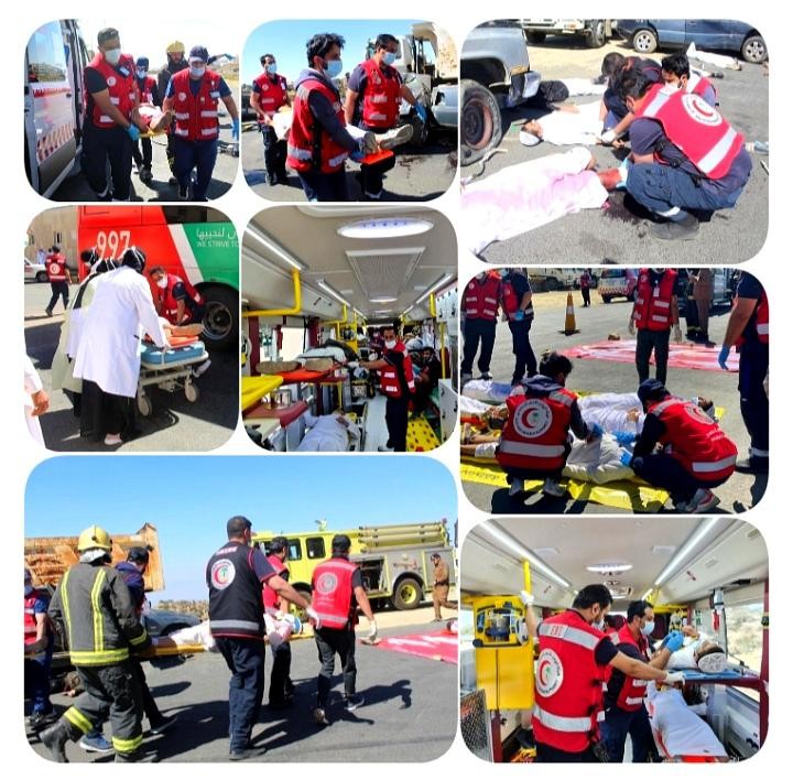 نفذت هيئة الهلال الأحمر بمنطقة عسير وبإشراف ومتابعة من قبل سمو أمير منطقة عسير فرضية وهمية تمثلت في ورود بلاغ من أحد المواطنين لمركز عمليات الهلال الأحمر السعودي 997 بوجود حادث تصادم لشاحنة نقل مع أربع سيارات وذلك عند تمام الساعة العاشرة صباحاً، وعلى الفور تم توجيه فرق إسعافية من الهلال الأحمر لمباشرة الحادث والذي نتج عنه حالتي وفاة و ١٨ إصابة.