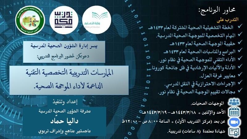 نفذت الإدارة العامة للتعليم بمنطقة مكة المكرمة، ممثلة في إدارة الشؤون الصحية المدرسية، برنامجاً تدريبياً عن بعد بعنوان الممارسات التدريبية التخصصية التقنية الداعمة لأداء الموجهة الصحية، وذلك في يومي الأحد والاثنين الموافق 18-19/3/1442هـ، نفذته مشرفة الشؤون الصحية المدرسية داليا حمّاد، عبر القاعة الافتراضية التابعة لإدارة التدريب والابتعاث بمركز التدريب الأول بمكة، بمتابعة من مساعدة مدير إدارة الشؤون الصحية المدرسية الأستاذة رضية الخطابي، والتي ألقت فيه كلمتها التي أوضحت فيها دور الموجهة الصحية في تحسين البيئة التعليمية المحفزة للإبداع والابتكار وتحقيق أهداف الصحة المدرسية العلاجية والوقائية والثقافية والتطويرية من خلال تطبيق برامج صحية تثقيفية توعوية تعنى بصحة الطالبات والمجتمع المدرسي حسب ما ورد في الخطة التشغيلية، وأنه لا بد من تطوير مهارات الموجهة الصحية باكتساب الخبرات الجديدة التي تساهم في تطوير أداء عملها وتحسين مخرجاته بالشكل المطلوب.