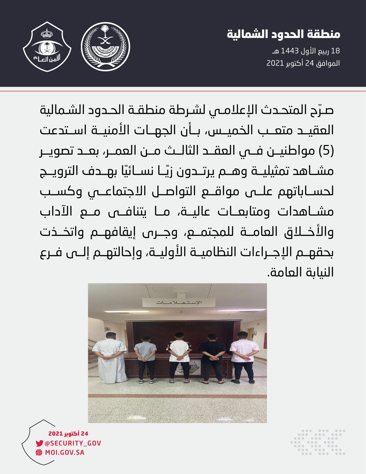 صرح المتحدث الإعلامي لشرطة منطقة الحدود الشمالية العقيد متعب الخميس، بأن الجهات الأمنية استدعت (5) مواطنين في العقد الثالث من العمر، بعد تصوير مشاهد تمثيلية وهم يرتدون زيًا نسائيًا بهدف الترويج لحساباتهم على مواقع التواصل الاجتماعي، وكسب مشاهدات ومتابعات عالية، ما يتنافى مع الآداب والأخلاق العامة للمجتمع، وجرى إيقافهم واتخذت بحقهم الإجراءات النظامية الأولية، وإحالتهم إلى فرع النيابة العامة.