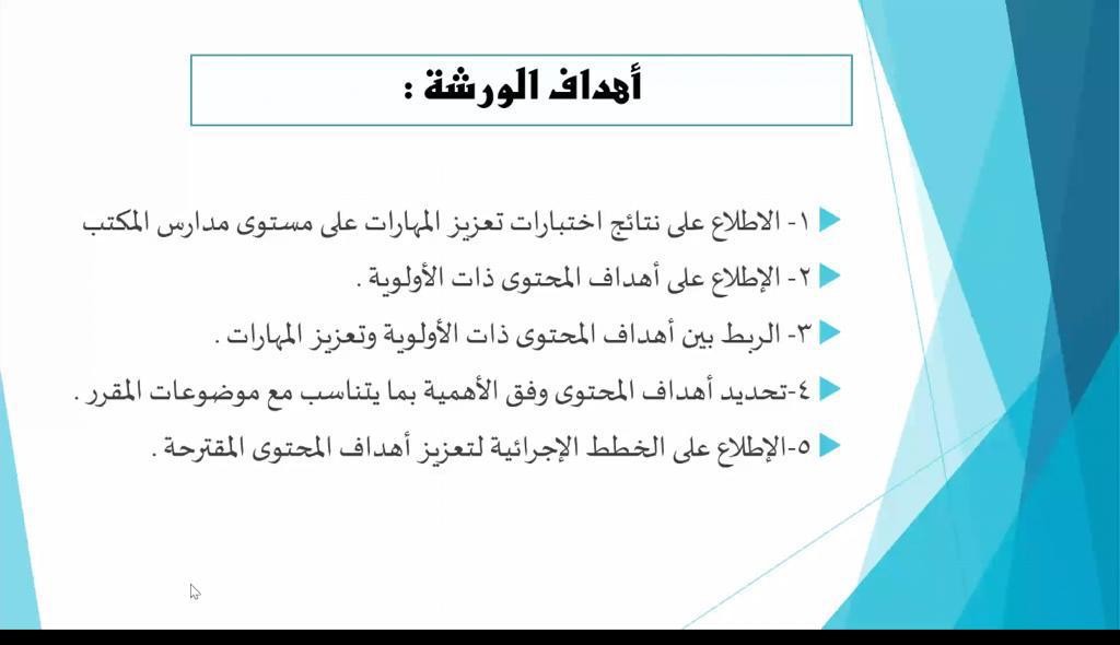 استهدفت الورشة ٢٣٠ معلمة من معلمات العلوم بجميع المراحل وذلك بهدف تعزيز أهداف  المحتوى ذات الأولوية  والاطلاع على نتائج اختبارات تعزيز المهارات على مستوى مدارس المكتب، والاطلاع على أهداف  المحتوى ذات الأولوية  ، والربط بين أهداف المحتوى ذات الأولوية وتعزيز المهارات، تحديد أهداف المحتوى وفق الأهمية بما يتناسب مع موضوعات المقرر واستعراض الخطط الإجرائية لتعزيز أهداف المحتوى.