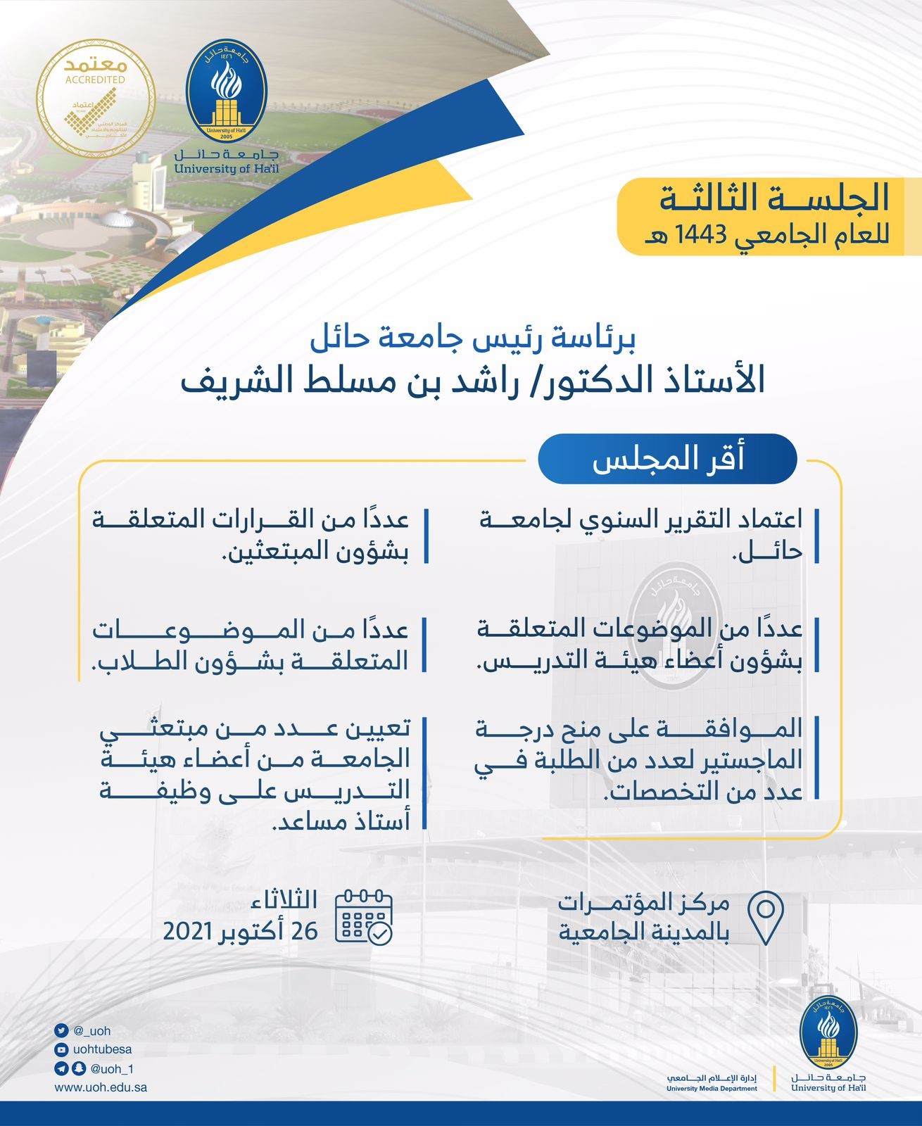عقد مجلس جامعة حائل جلسته الثالثة للعام الجامعي 1443هـ، هذا اليوم الثلاثاء، برئاسة رئيس الجامعة، الأستاذ الدكتور راشد بن مسلط الشريف، وبحضور الأمين العام لمجلس شؤون الجامعات، الدكتور محمد الصالح، عبر الاتصال المرئي، وكذلك أعضاء المجلس، والأمين، وذلك في مبنى المؤتمرات بالمدينة الجامعية، وناقش المجلس خلال الاجتماع عدداً من الموضوعات المدرجة على قائمة الأعمال.