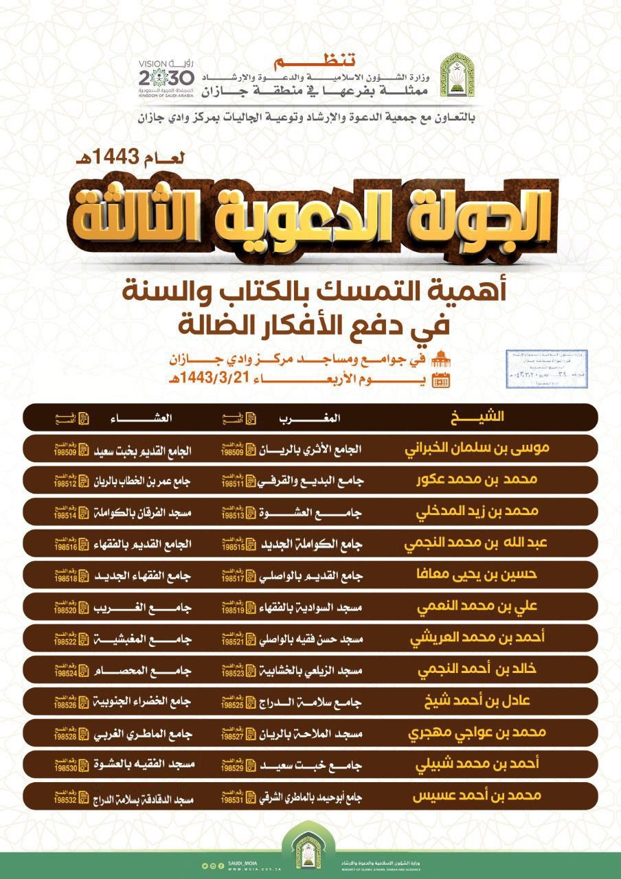 يُنظم فرع وزارة الشؤون الإسلامية والدعوة والإرشاد في منطقة جازان بتوجيه من فضيلة مدير عام فرع الوزارة بالمنطقة الشيخ اسامة بن زيد المدخلي وبالتعاون مع جمعية الدعوة والإرشاد وتوعية الجاليات بمركز وادي جازان الجولة الدعوية الثالثة لعام 1443 للهجرة في الأمن الفكري والتي تأتي بعنوان " أهمية التمسك بالكتاب والسنة في دفع الأفكار الضالة "