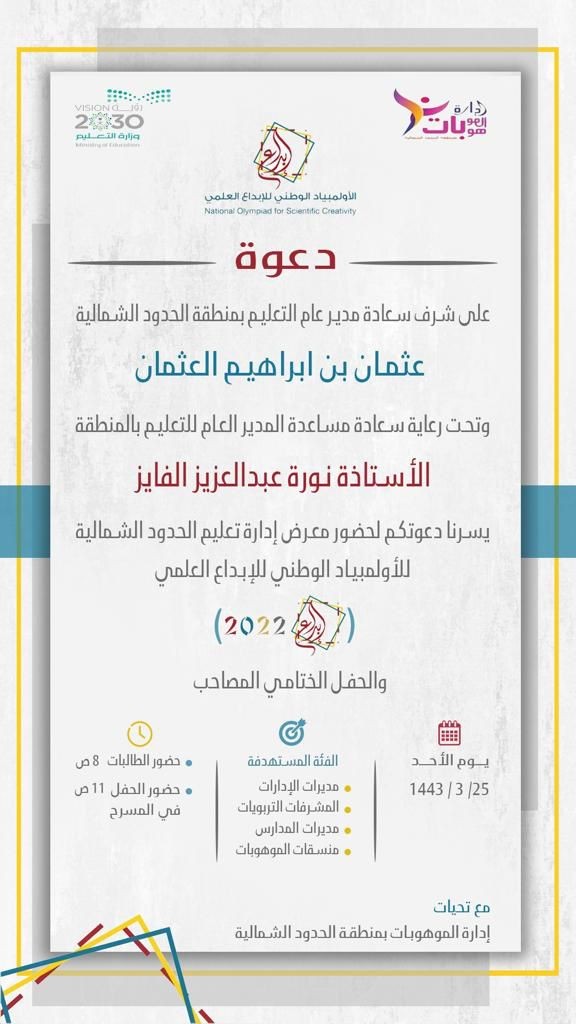 يرعى مدير عام التعليم بمنطقة الحدود الشمالية الأستاذ عثمان بن ابراهيم العثمان وبحضور مساعدة المدير العام للتعليم بالمنطقة الاستاذة نورة عبدالعزيز الفايز معرض إدارة تعليم الحدود الشمالية للأولمبياد الوطني للإبداع العلمي (ابداع ٢٠٢٢) والحفل الختامي المصاحب له ، وذلك يوم الأحد الموافق ٢٥ /٣ / ١٤٤٣ على مسرح مبنى الإدارات النسائية بعرعر