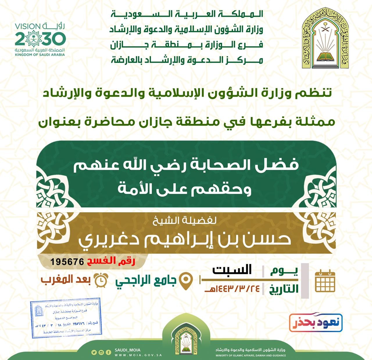 نفَّذَت وزارة الشؤون الإسلامية والدعوة والإرشاد ممثلة بفرعها في منطقة جازان " مركز دعوة العارضة "  محاضرة دعوية عن " فضل الصحابة رضي الله عنهم وحقهم على الأمة " مساء السبت الموافق