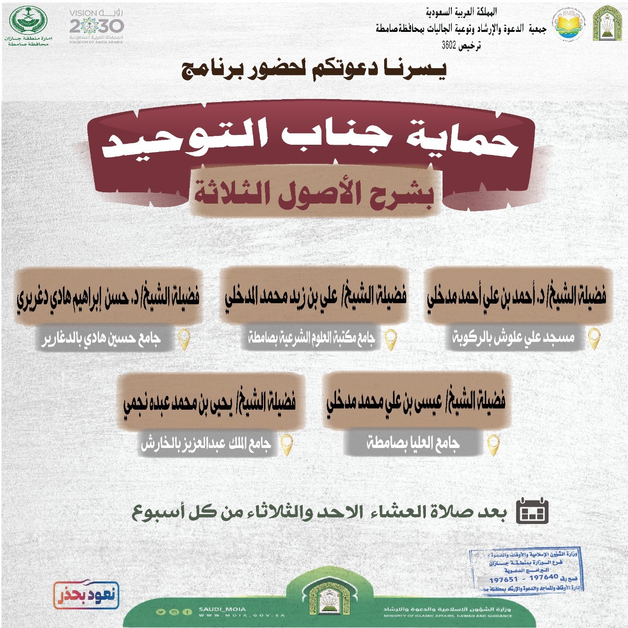 ينظم فرع وزارة الشؤون الإسلامية والدعوة والإرشاد في منطقة جازان بالتعاون مع جمعية الدعوة والإرشاد وتوعية الجاليات بمحافظة صامطة دروس اسبوعية بعنوان " حماية جناب التوحيد " بشرح الأصول الثلاثة وستُقام بعد كل صلاة عشاء يَوْمَيْ الأحد والثلاثاء من كل اسبوع وسيتحدث عنها كلاً من ؛ فضيلة الشيخ الدكتور أحمد بن علي مدخلي بمسجد علي علوش في الركوبة وفضيلة الشيخ علي بن زيد مدخلي بجامع مكتبة العلوم الشرعية بصامطة وفضيلة الشيخ الدكتور حسن بن ابراهيم دغريري في جامع حسين هادي بالدغارير وفضيلة الشيخ عيسى بن علي مدخلي في جامع العليا بصامطة وفضيلة الشيخ يحيى بن محمد نجمي بجامع الملك عبدالعزيز بالخارش .