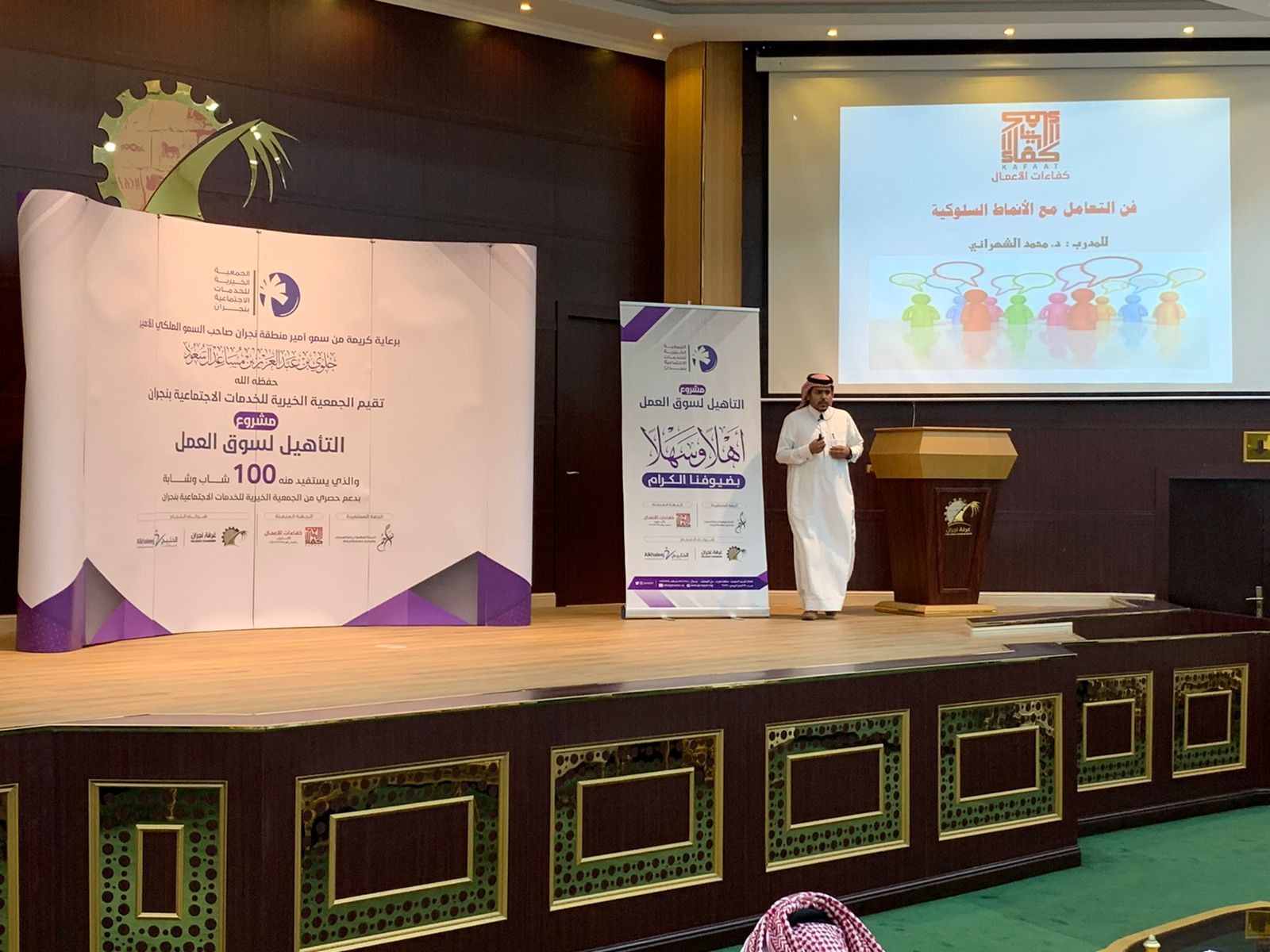 كما أوضح الدكتور محمد بن سعيد الشهراني مدير عام معهد كفاءات الأعمال للتدريب الجهة المنفذة للمشروع ، أن المشروع يهدف للتأهيل النفسي والمهاري للمستفيدين ، من خلال تقديم ست دورات تطويرية خلال ٣ أسابيع وهي« فنون التعامل مع الأنماط السلوكية ، و مهارات حل المشكلات ، و مهارات التعامل مع ضغوط الحياه ، و مهارات الإلقاء والمتحدث الجيد ، و الولاء والانتماء والرضى النفسي ، و مهارات التخطيط الشخصي » ودورتين مهارية تخصصية خلال شهر  وهي «مهارات استخدام الحاسب الآلي في الأعمال المكتبية ، وأساسيات صيانة الجوالات.