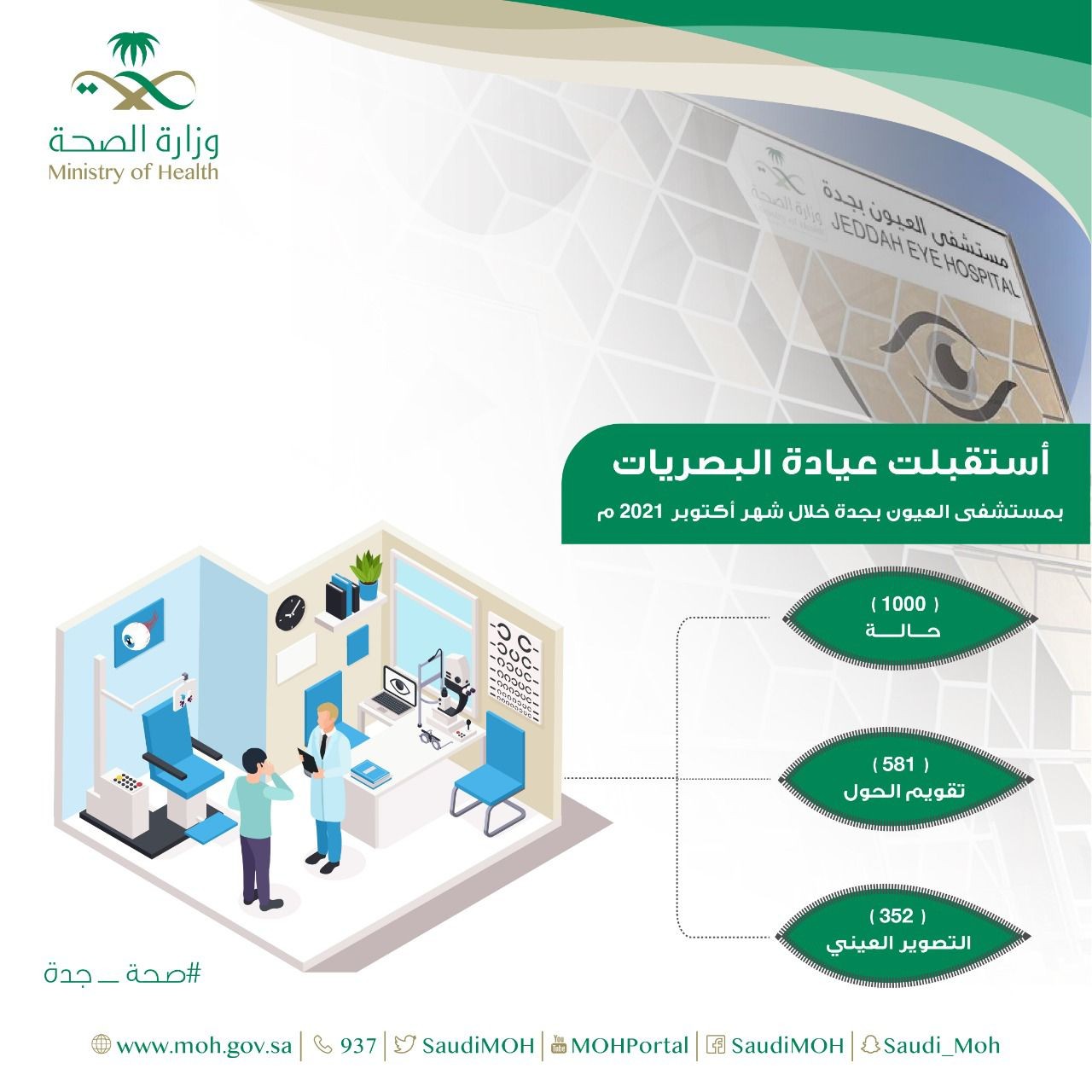 أستقبلت عيادة البصريات بمستشفى العيون بجدة خلال شهر أكتوبر الماضي من العام الحالي ٢٠٢١ م ما يقارب (١٠٠٠) حالة، وقد كانت أعلى نسبة للمراجعين خلال شهر، كان النصيب الأكبر منهم لمراجعي قسم كسل العين و تقويم الحول بعدد (٥٨١) حالة، يليه قسم التصوير العيني بـ (٣٥٢) حالة.