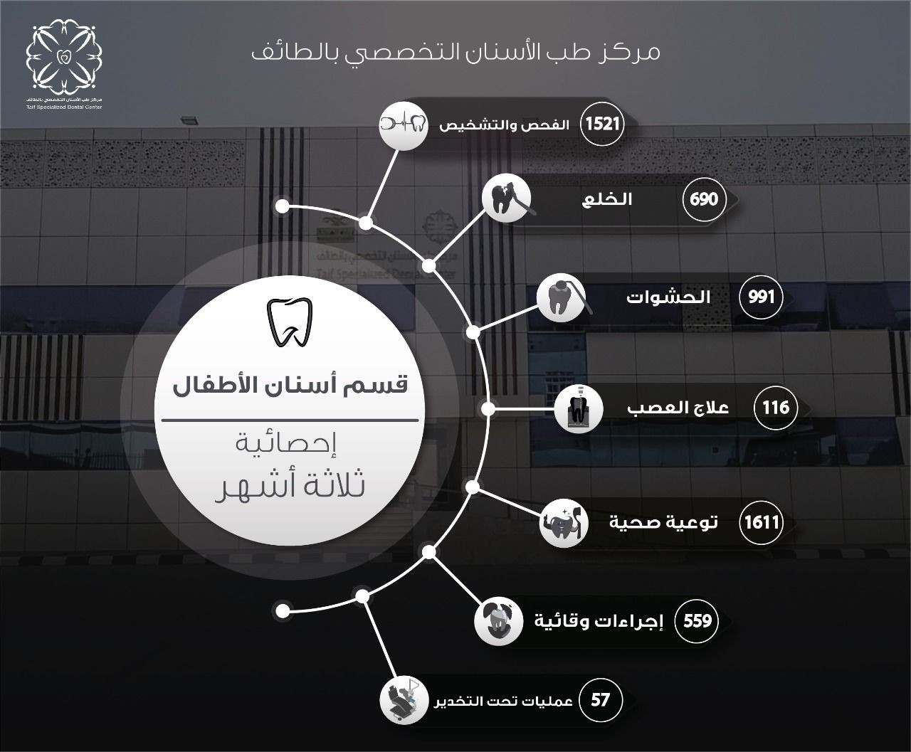 وأشارت صحة الطائف عن توفر عيادة أطفال متخصصة في المركز، تقوم بدورها في خدمة هذه الفئة، حيث قدمت العيادة خدمات الفحص التشخيصي لـ 1521 طفل وطفل فيما قدمت خدمات الخلع 690 فيما قدمت الحشوات لـ 991 كما تم علاج العصب لـ 161 وتم إجراءات وقائية لـ 559 فيما تم إجراء 57 عملية تحت التخدير ، فيما قدم المركز خدمات التوعية الصحية لـ 1611.