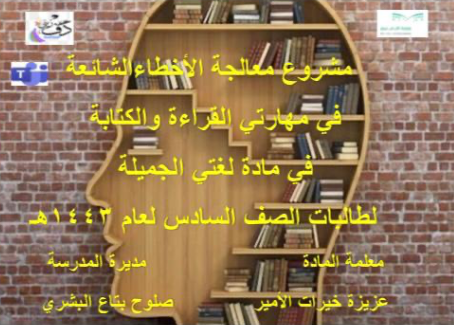 نفذته معلمة لغتي الجميلة عزيزة الأمير بمساندة مديرة المدرسة: صلوح الحربي مستهدفا طالبات الصف السادس لمعالجة الأخطاء الشائعة التي تقع فيها بعض الطالبات ورفع المستوى التحصيلي للطالبات وتعميق المفاهيم والمشاركة في المسابقات الدولية للقراءة للوصول بالطالبات لمستويات الفهم القرائي.
