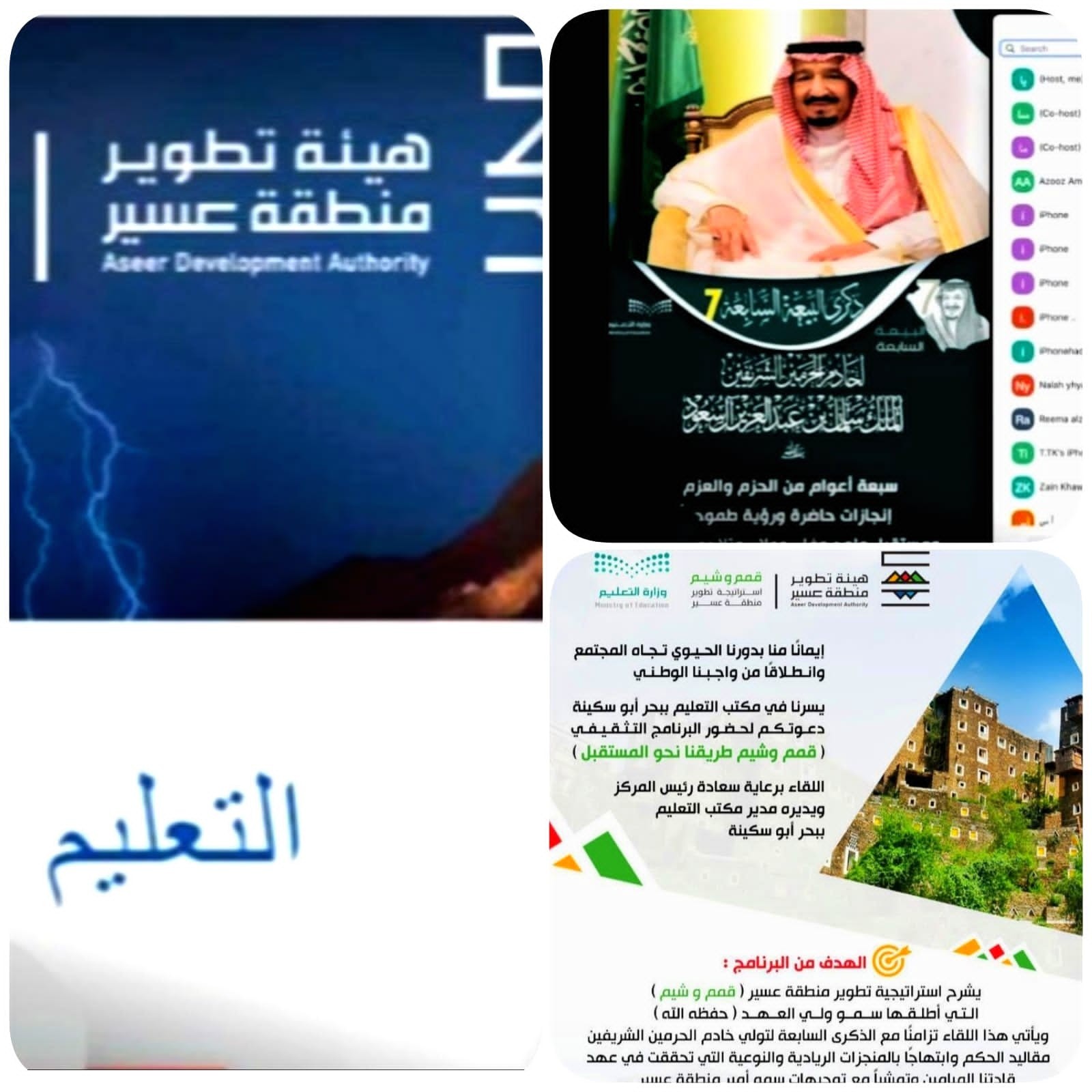 نفذ مكتب التعليم ببحر أبو سكينة مساء أمس برنامجاً تثقيفياً عن بعد حول استراتيجية تطوير منطقة عسير بعنوان "قمم و شيم" طريقنا نحو المستقبل تزامنًا مع الذكرى السابعة للبيعة لتولي خادم الحرمين الشريفين مقاليد الحكم وإبتهاجاً وتماشياً مع توجيهات أمير منطقة عسير.