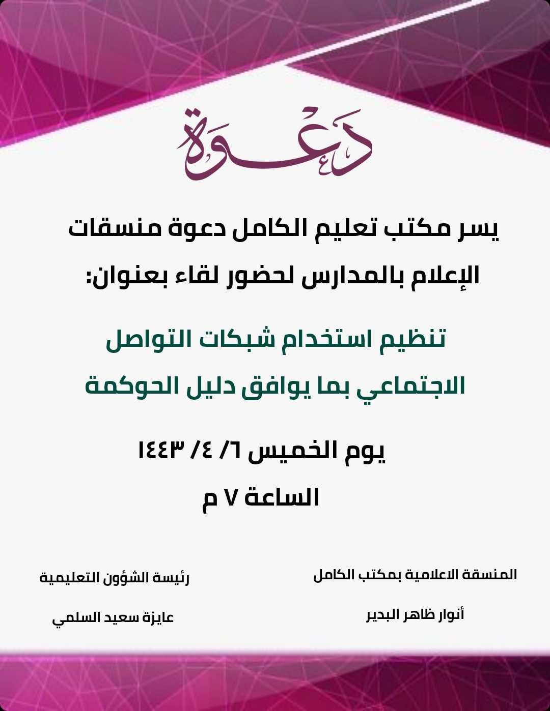 نفذت الإدارة العامة للتعليم بمنطقة مكة المكرمة ممثلة بمكتب تعليم الكامل يوم الخميس ٤/٦/ 1443 لقاءً إرشاديا بالمنسقات الإعلاميات بالمكتب، نفذتهُ المنسقة الإعلامية أنوار البدير.